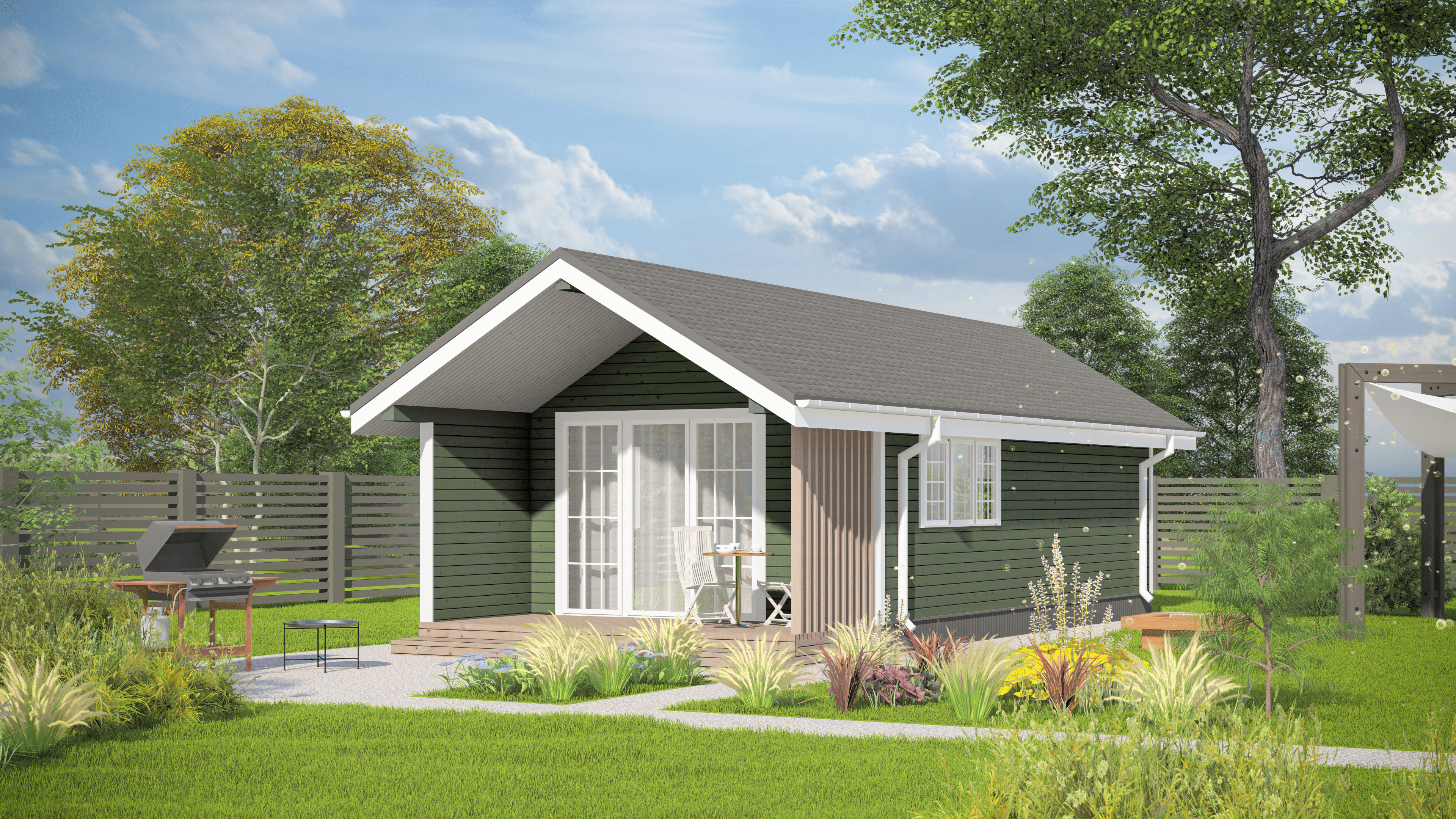 - Открытая терраса: логичное продолжение гостиной, расширяющее пространство дома станет любимым местом для завтраков на свежем воздухе.
